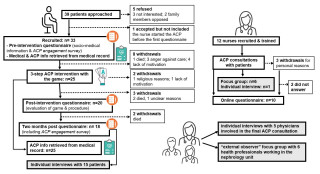AbstractContexte To support advance care planning (ACP), a conversation game – Anticip'action – and a connected 3-step ACP intervention using the game were developed. Objectiv This study assesses the acceptability, feasibility and effect of the intervention with patients undergoing dialysis at a tertiary hospital. Méthode Dialysis nurses received a 10-hour training in ACP and use of the card game Anticip’Action. All patients dialysed in the division of nephrology were eligible. Acceptability and feasibility were assessed with questionnaires and note taking. Effect was assessed with pre-post number of advance directives (AD), number of patients designating a surrogate, quality of written ACP documentation, patients’ responses to the 9-items ACP Engagement Survey, and patients’ assessment of their ACP documentation. Résultats 12 nurses conducted ACP interventions. 33 patients (87% of eligible patients) accepted to be included, 25 (75%) started the ACP intervention, 23 completed it, and 18 answered all questionnaires. 5 withdrawals were due to premature death. Nurses and patients rated the training, the intervention and the card game as good and highly acceptable: mean scores ranged from 2.87 to 4.17 on 5-point Likert scale questions. Organizational difficulties were reported by nurses. Significant increases were observed on uploaded AD (+30%), designated healthcare surrogates (+80%), patients reporting end-of-life planning actions (12/19), patients’ engagement in ACP (+1.04 on 1-5 scale, p= <.001), quality of ACP documentation (+2.68 on a 1-5 scale, p= <.001), and patients’ evaluation of their ACP documentation (3.44 ±1.04 on 1-5 scale). Conclusion The 3-step ACP intervention using Anticip’action showed good implementation potential in clinical context. ![]() ![]() |