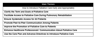 AbstractContexte Patients with progressive respiratory diseases experience debilitating physical and psychological symptoms that worsen as the disease advances. It is well established that their access to palliative care (PC) remains limited and often occurs at a late stage, sometimes at the very end of life. Objectiv The aim of this study is to explore how to integrate PC earlier and more appropriately into the management of these patients. Méthode A qualitative study using focus groups (FG) was conducted with a purposive sample of patients with chronic respiratory diseases (stage 3 or 4 COPD according to GOLD, or advanced fibrotic interstitial lung disease) and their informal caregivers. Data were analyzed by two independent researchers using Braun and Clarke’s thematic analysis method, supported by the MAXQDA software. Résultats A total of 5 patients and 5 informal caregivers participated in two separate focus groups, each lasting an average of 83 minutes. The term "palliative care" raised questions and concerns. Participants emphasized the need to clarify the goals of palliative care, highlighting the importance of preserving quality of life. They advocated for the systematic introduction of PC from the time of diagnosis, outside of crisis situations. Group discussions, such as roundtables during pulmonary rehabilitation, were identified as effective ways to introduce PC, especially by benefiting from peer experiences. Participants agreed that discussions about care planning and advance directives not only reduce the decision-making burden on caregivers but also reassure patients by ensuring their wishes will be respected. Table 1 presents a summary of the main themes. Conclusion After receiving information about the goals of palliative care, patients clearly expressed a desire to access it early in order to better manage symptoms, receive continuous support, and anticipate future care. Table 1 – How to Introduce Palliative Care Early and Appropriately – Main Themes ![]() |