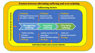 AbstractAt the end of life, patients frequently experience distressing symptoms. When they become refractory, medications for palliative sedation are used to alleviate unbearable suffering. Applying palliative sedation relies on defined procedures according to guidelines and should therefore be primarily conducted in specialist settings. However, little is known about how registered nurses (RN), advanced practice nurses (APN), and healthcare assistants (HCA) manage refractory symptoms in nursing homes, and how sedating medications for palliative sedation are used in this non-specialist setting. Ziel The aim of this study is to examine how RN, APN and HCA alleviate distressing and refractory symptoms in Swiss nursing homes, the challenges they face, the strategies and interventions they employ to alleviate residents’ suffering. Methode This qualitative study involved nursing personnel from seven nursing homes in German-speaking Switzerland. Until data saturation, seven semi-structured focus group interviews were conducted between October 2023 and January 2024, transcribed verbatim, and analysed using a grounded theory approach. Resultate Twenty RN, two APN and six HCA participated in the seven focus group interviews. A core category, ‘Tension between alleviating suffering and over-sedating’, was identified with three subcategories: (1) recognising suffering, (2) assessing suffering, and (3) alleviating suffering. Challenges included (a) distinguishing between own (healthcare professionals) and others’ (residents or relatives) suffering, (b) interactions with residents’ relatives and general practitioners (GP), and (c) uncertainties with sedating medication. Strategies they employed to address these challenges, such as (a) ‘double-checking principle’, (b) ‘getting everyone on the same page’, and (c) ‘safety net’, were identified. Personnel and financial resources, as well as individual beliefs and societal attitudes influenced the use of sedating medication. Schlussfolgerung RN, APN and HCA in nursing homes face complex challenges related to the use of sedating medication. Strategies such as emphasising shared decision-making, interprofessional collaboration and involving palliative care specialists are essential. Without applying these strategies, there is a risk to manage care demands rather than alleviate suffering appropriately by using sedating medication.
